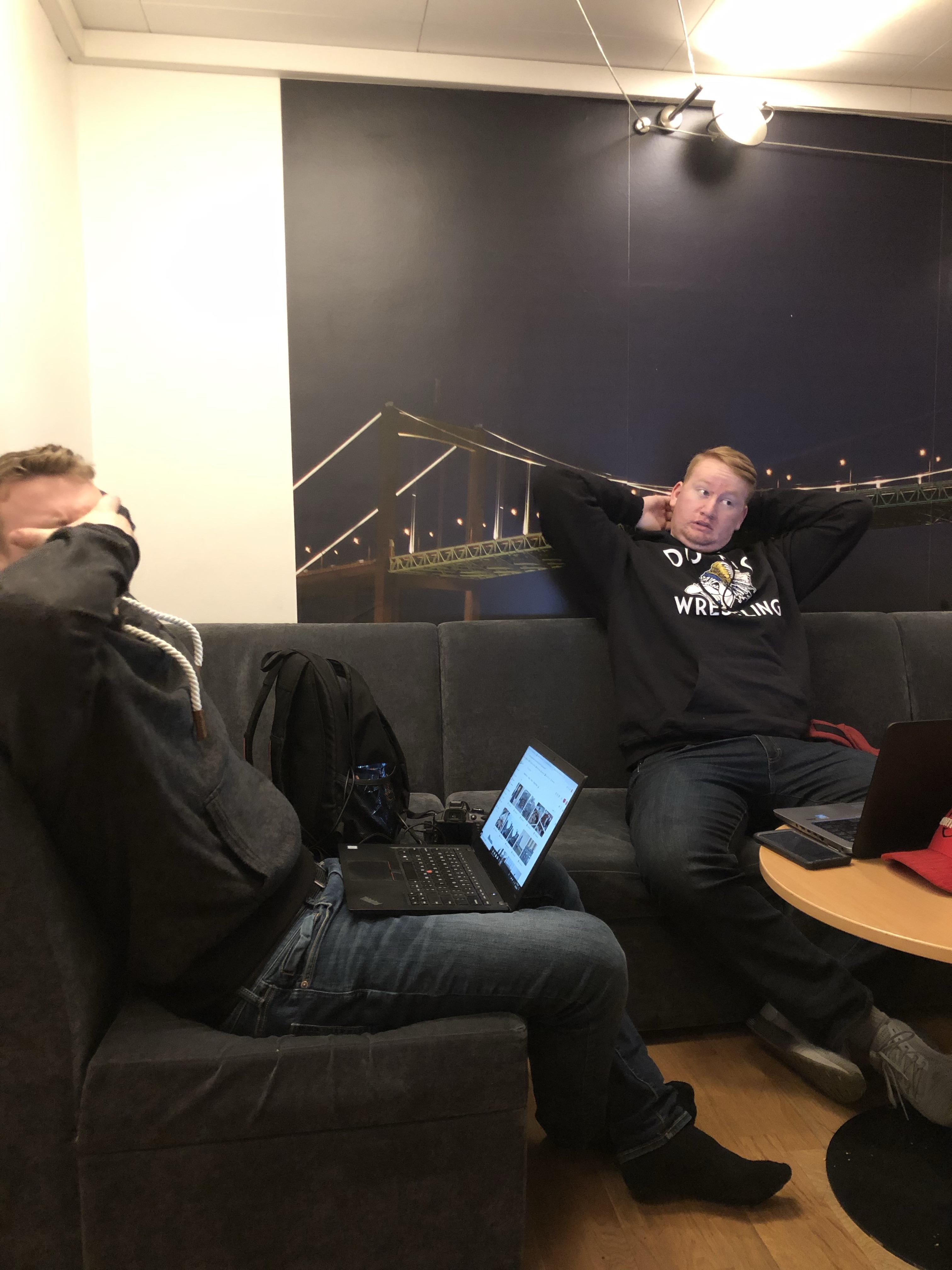 We have been setting up our workspace in the basement lounge. We are normally in this room till about 3am every night having laughs and kicking back! Its hard to post pictures for this page because we are constantly on the move!